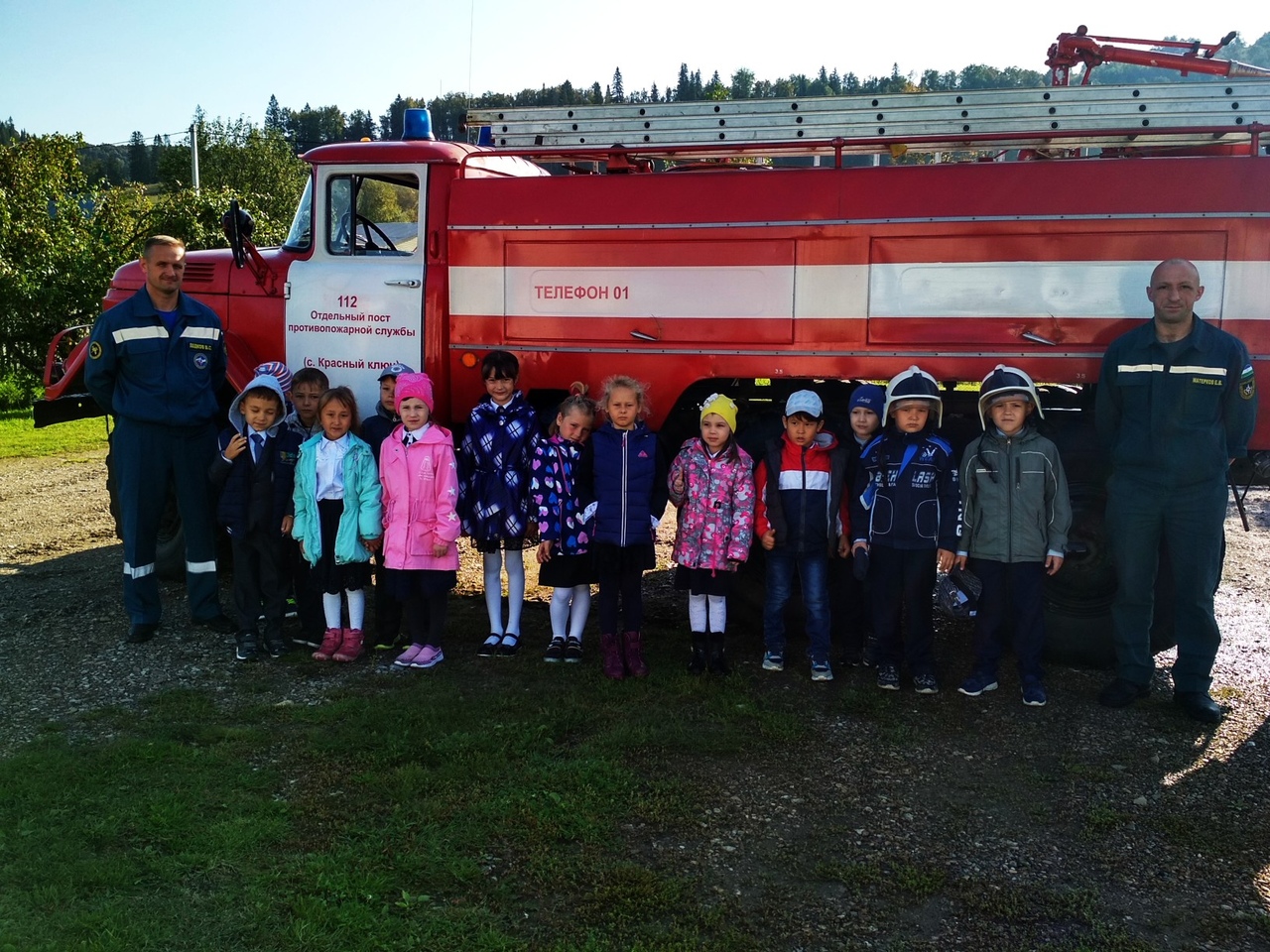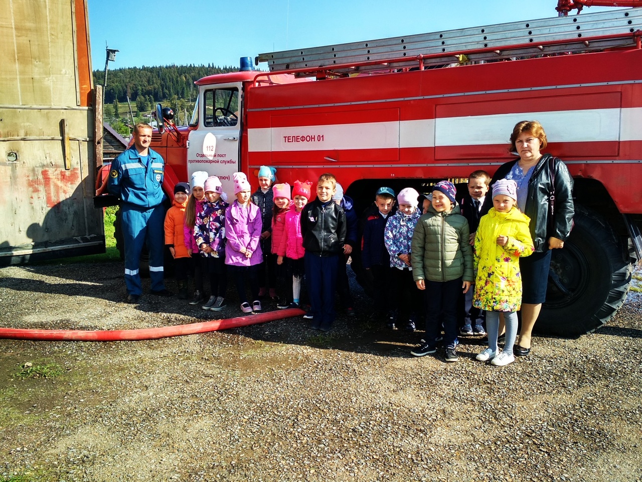 6 сентября нашим первоклассникам провели экскурсию в пожарную часть с. Красный Ключ. Начальник части, Дедков Вячеслав Сергеевич, познакомил детей с профессией пожарного и условиями работы. Каждый ученик побывал за рулём пожарной машины, сказал пару слов в громкоговоритель, а так же надел шлем пожарного.