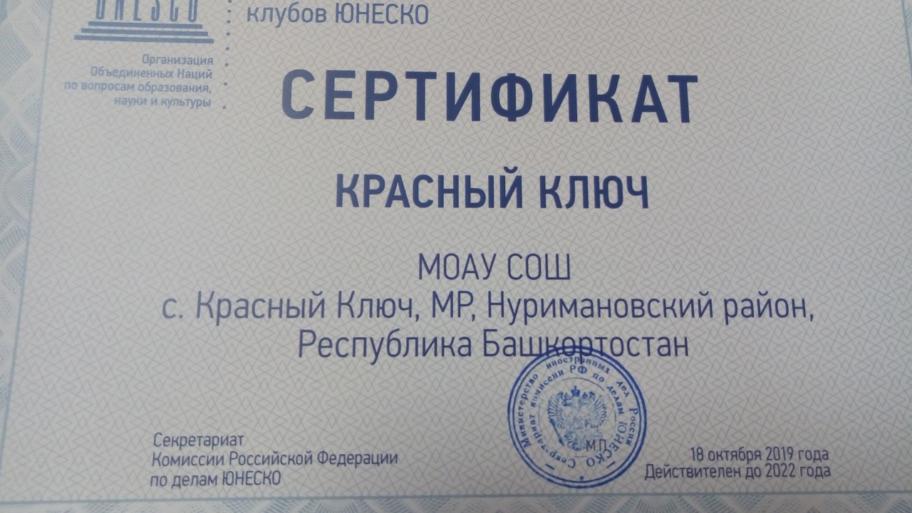 24 октября, в г. Уфа, в рамках IV Евразийского гуманитарного форума, Орджоникидзе Григорий Эдуардович - ответственный секретарь Комиссии Российской Федерации по делам Юнеско вручил нашей школе Сертификат Клуба друзей ЮНЕСКО.