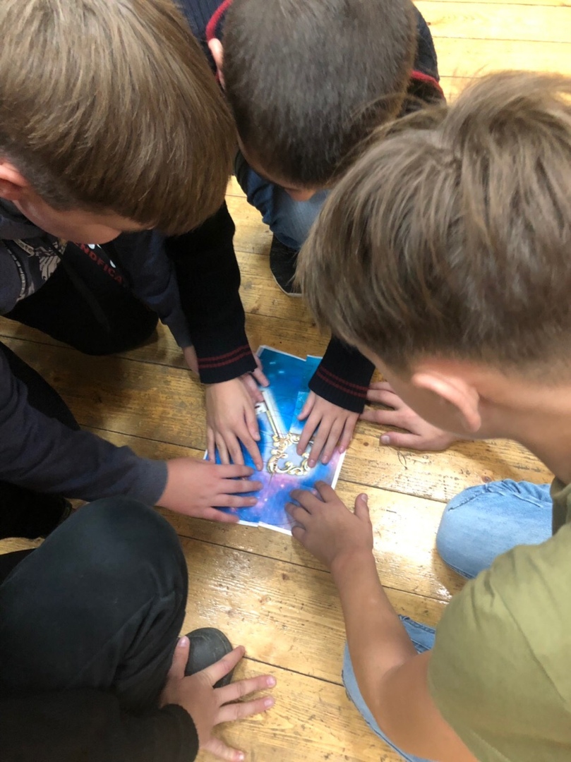 ☑Дети под зажигательную музыку проходили музыкальный квест, где они шаг за шагом выполняли задания. За каждое пройденное задание дети получали по одной подсказке. Собрав все части подсказок и объединив их в единый рисунок, дети отправились в столовую. Там то их и ждал приз - целая кладовая полезных фруктов, яблоки.