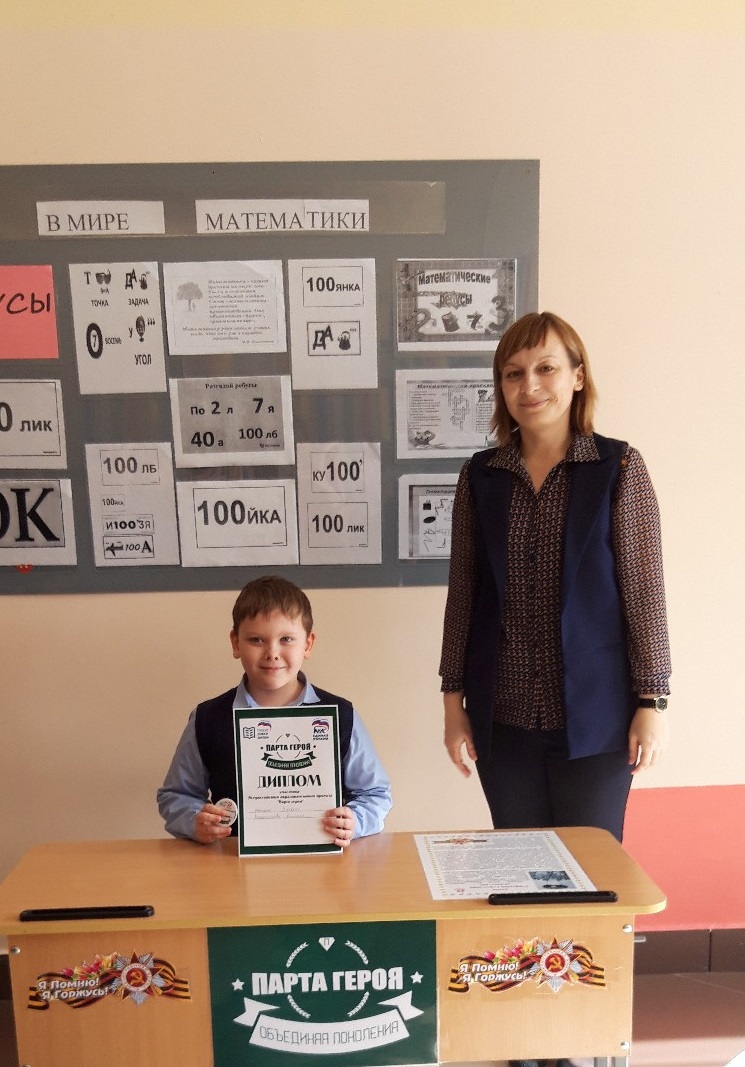 17 марта, на очередной школьной линейке торжественное право сидеть за Партой Героя было предоставлено ученику 2 класса Новокшонову Кириллу. На прошедшей неделе за Партой Героя сидела ученица 1б класса Иконникова Мария. Ребятам были вручены дипломы и значки участников Всероссийского образовательного проекта "Парта героя".