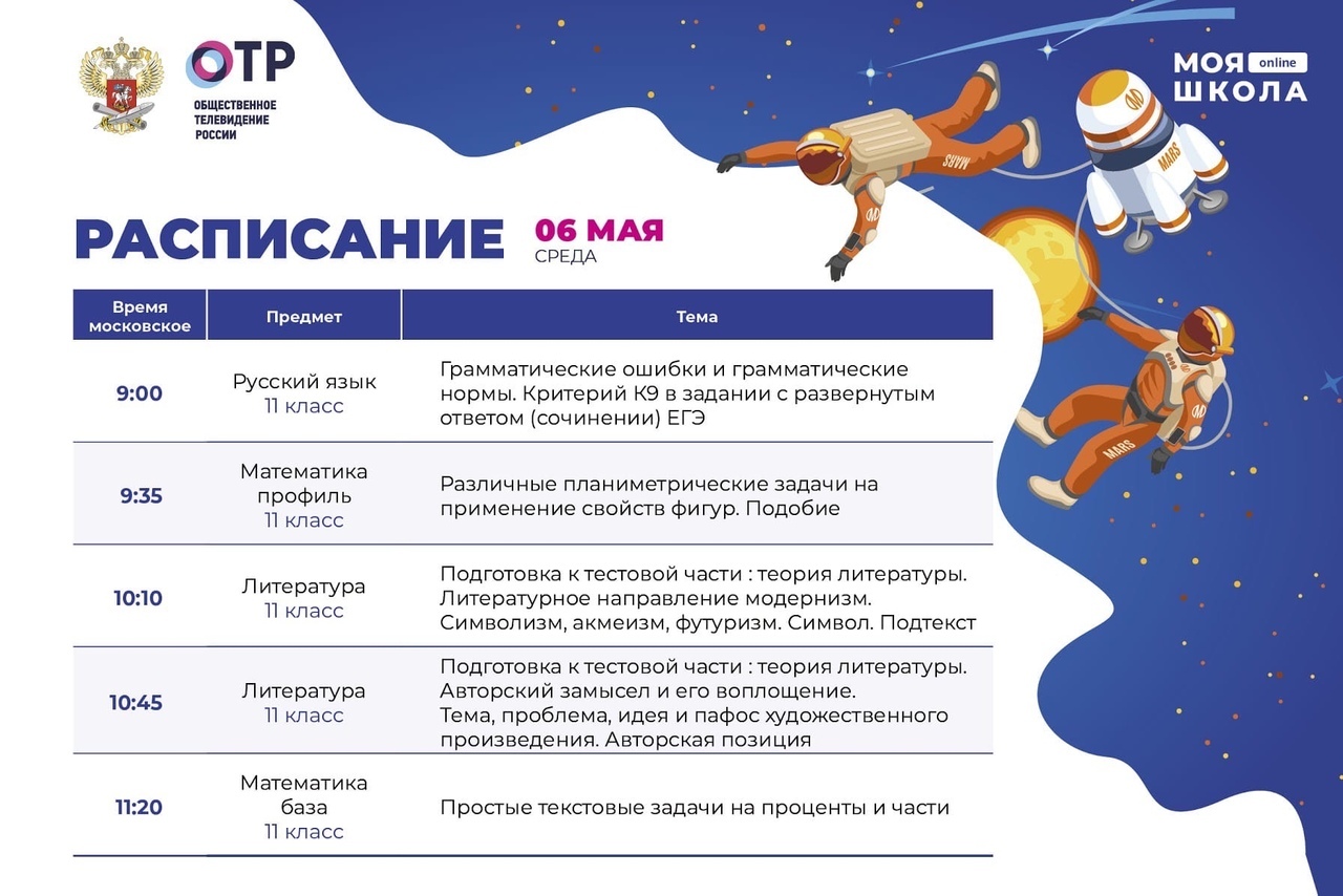 Друзья! Смотрите расписание видеоуроков на Общественном телевидении России на 6 мая!