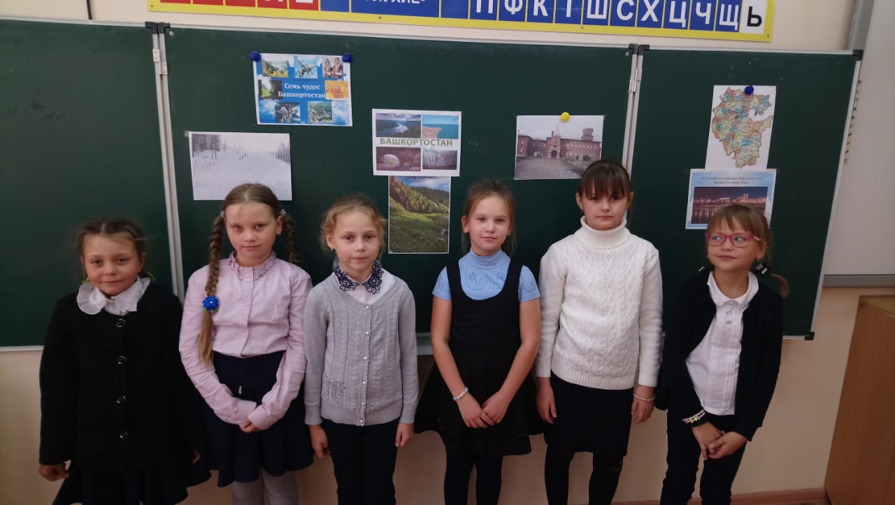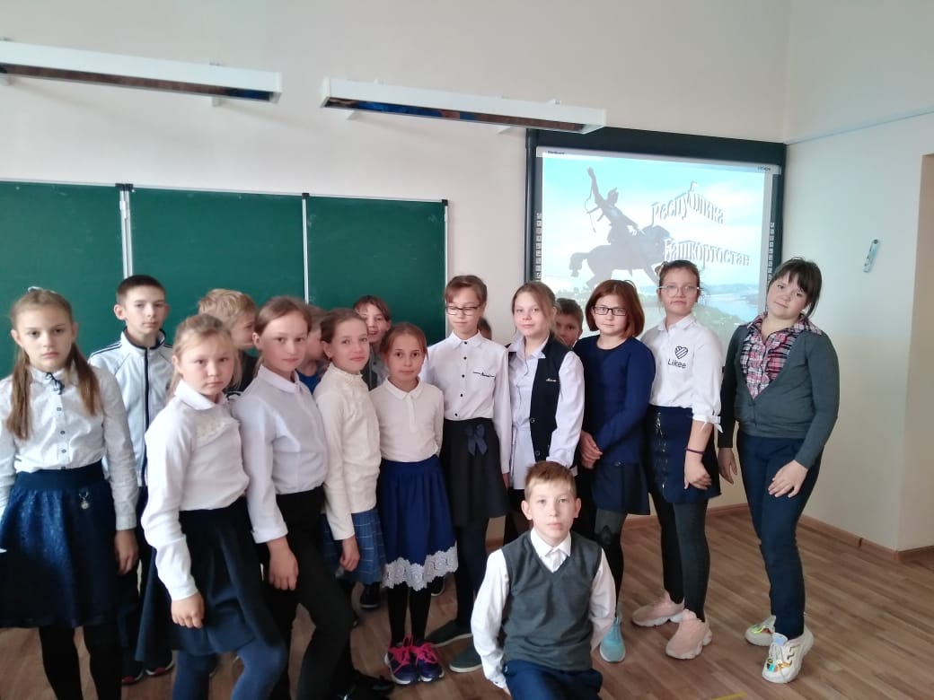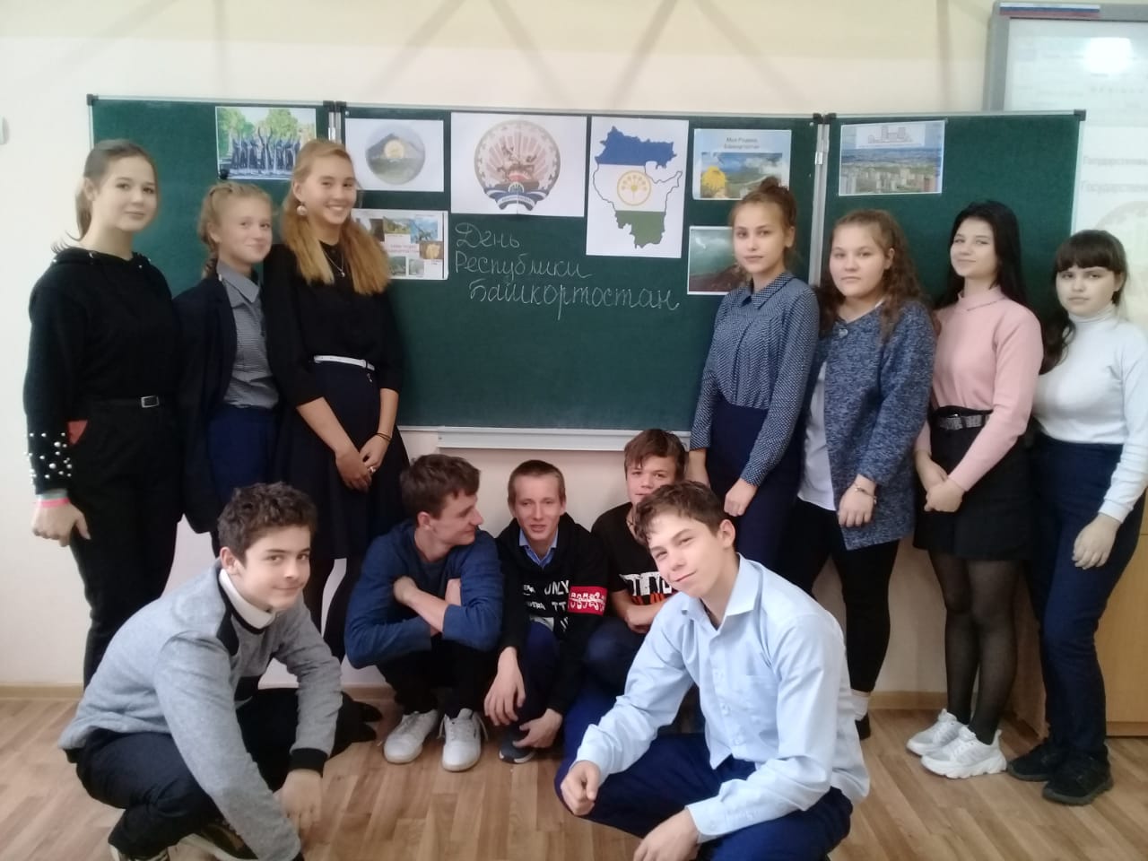 9 октября в 1-11 классах были проведены классные часы, посвященные Дню Республики Башкортостан на темы: " Мое государство - мое будущее", "Мой край родной - Башкортостан", "Чудеса Башкортостана", "Семь чудес Башкортостана" и другие. История нашей республики уникальна, как и ее природные достопримечательности. Ученики углубили свои знания об истории и культуре родного края. Посмотрели художественный фильм "Башкирия с древних времён до нас".