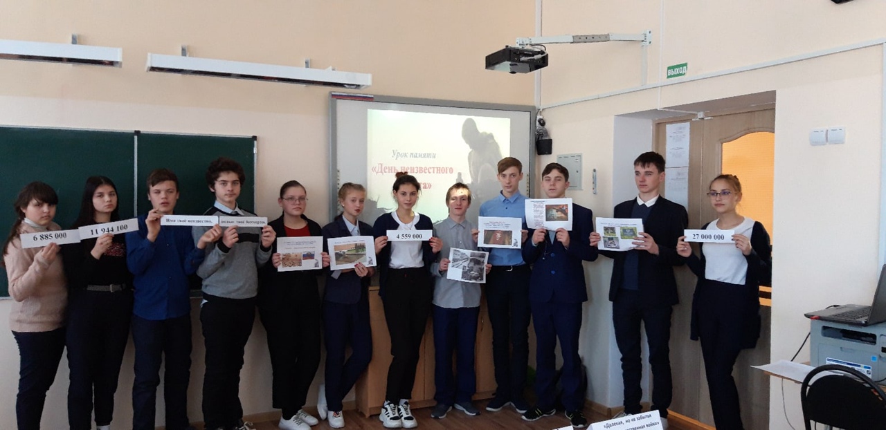 В День Неизвестного солдата в 9а классе прошел классный час "Памяти Неизвестного солдата". Классный руководитель, Иконникова Людмила Владимировна, рассказала ученикам о памятном дне, который посвящен Памяти Неизвестного солдата. В ходе урока ребята просмотрели презентацию и фильм об истории создания памятника Неизвестному солдату. Затем приняли участие в викторине по историческим датам Великой Отечественной войны 1941-1945 гг.