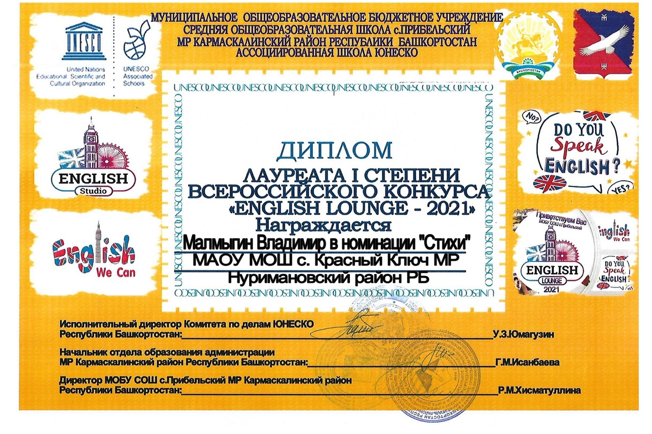 Во Всероссийском конкурсе "Английская гостиная", посвященном Всемирному Дню Поэзии, среди обучающихся Ассоциированных школ ЮНЕСКО, Клубов ЮНЕСКО Российской Федерации и Клубов друзей ЮНЕСКО Республики Башкортостан приняли участие Малмыгин Владимир, Данилов Владислав, Павлова Лада и Полежаева Милана Александровна. Организатором мероприятия стала МОБУ СОШ с. Прибельский Кармаскалинского района Республики Башкортостан. На конкурс были направлены видеоматериалы на английском языке в номинациях "Стихи", "Телефонный разговор", "Педагоги". Абсолютным победителем в в номинации "Стихи" среди учащихся 5-7 классов стал Малмыгин Владимир! Диплом лауреата I степени будет вручён ему на ближайшей общешкольной линейке. Дипломом лауреата I степени в номинации "Творческие педагоги" награждена Полежаева Милана Александровна.Дипломы II степени будут вручены Данилову Владиславу и Павловой Ладе. МОЛОДЦЫ, РЕБЯТА! Мы вами гордимся!