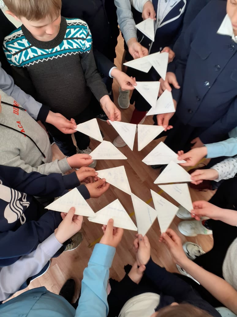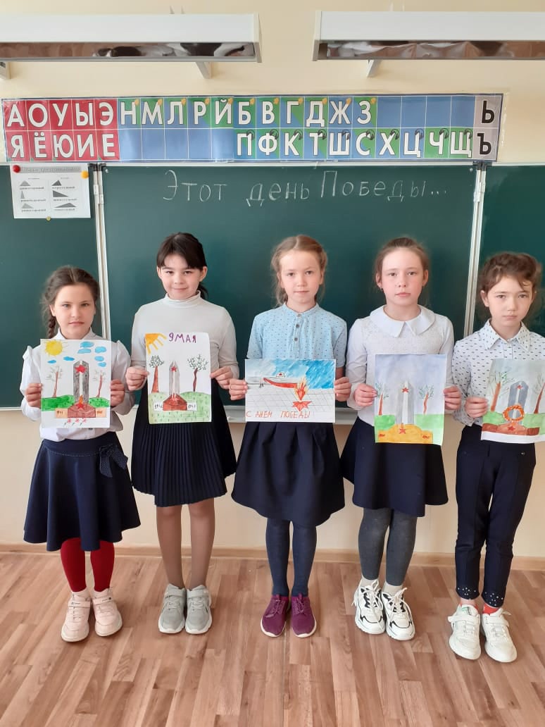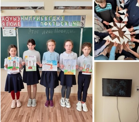 Ученики просмотрели документальный фильм, посвященный военной хронике. Ребята узнали, сколько лет длилась Великая Отечественная война, сколько миллионов людей погибло в ней. Мальчики и девочки написали на листочках бумаги "Письмо солдату", в которых они поблагодарили всех солдат за Великую Победу, затем нарисовали рисунки.